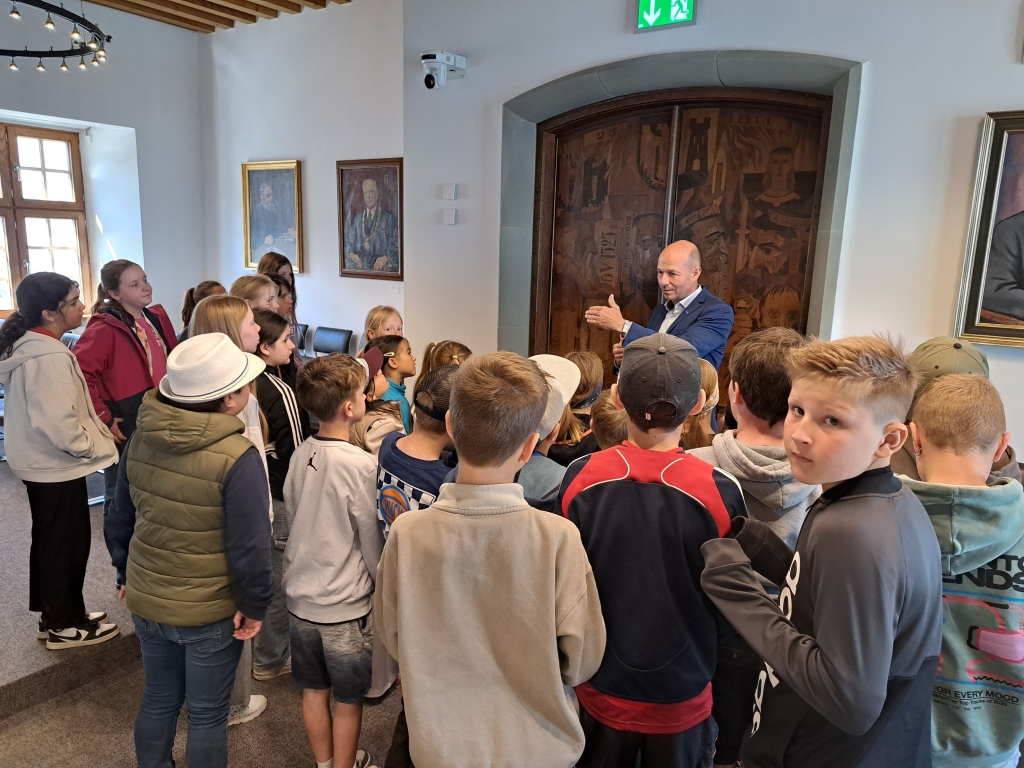Die vierten Klassen haben am 16.05.2025 einen aufregenden Ausflug in das Rathaus unternommen, um den Bürgermeister zu besuchen. Die Schülerinnen und Schüler hatten die Möglichkeit den beeindruckenden Sitzungssaal zu erkunden. Sie durften dem Bürgermeister ihre Fragen stellen und erfuhren auch wie Entscheidungen getroffen werden, die ihre Gemeinde betreffen.