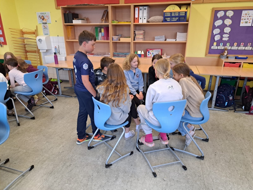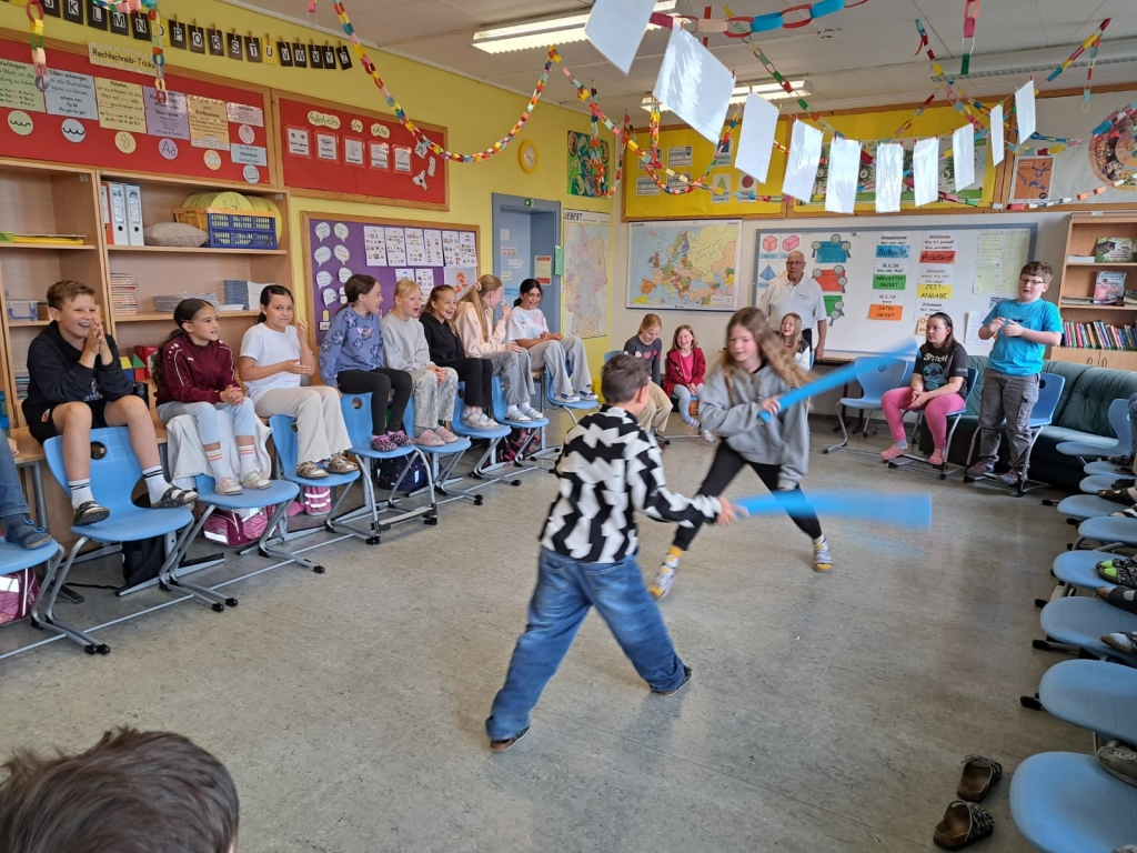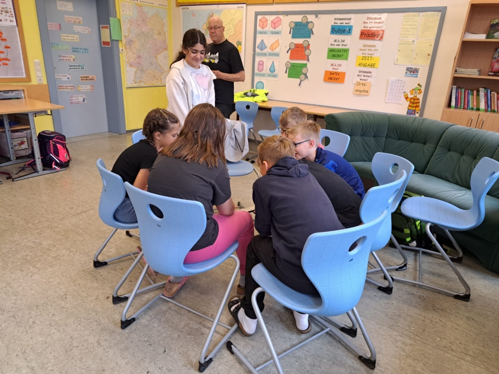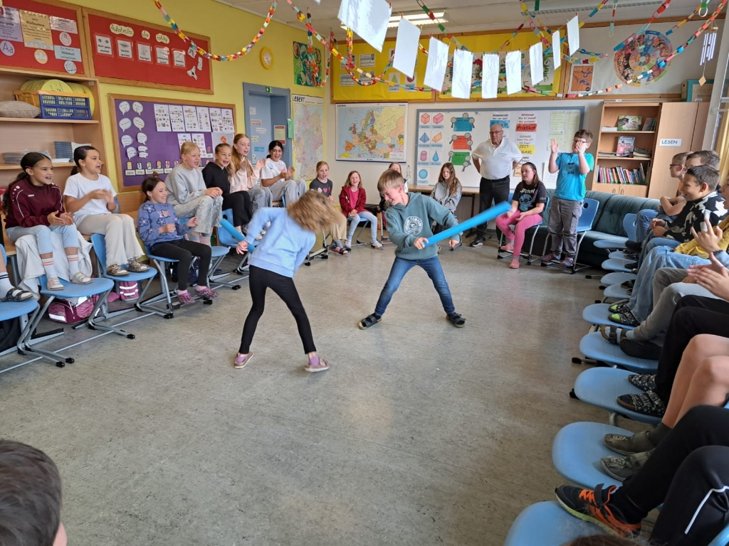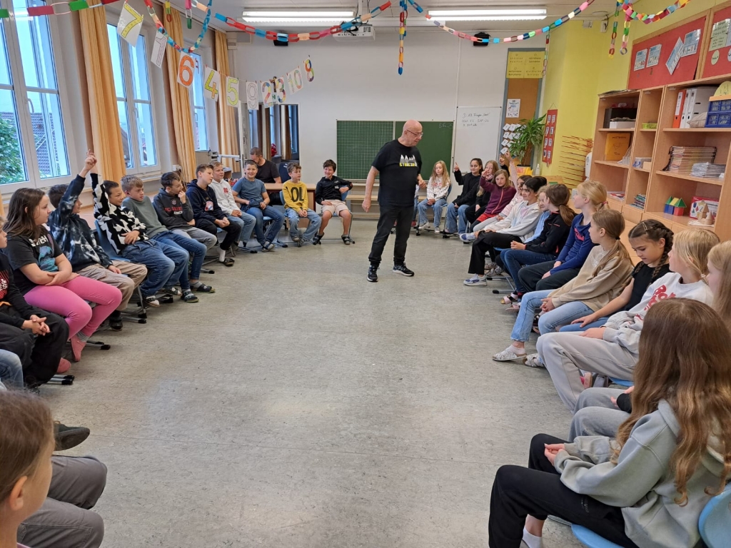 Am Mittwoch, 16. Oktober 2024 stand für uns nicht wie gewohnt Mathematik oder Deutsch, sondern das Sozialkompetenz-Training „Stark ohne Muckis“ mit Frau Rathgeber auf dem Stundenplan. Mit einer optimalen Mischung aus Theorie und Praxis haben wir wertvolle Dinge für unser Leben wie „mehr Sicherheit in Konfliktsituationen“, „selbstsichere Kommunikation“, „respektvoller Umgang untereinander“ und „eigene Grenzen klarer wahrnehmen“ gelernt.