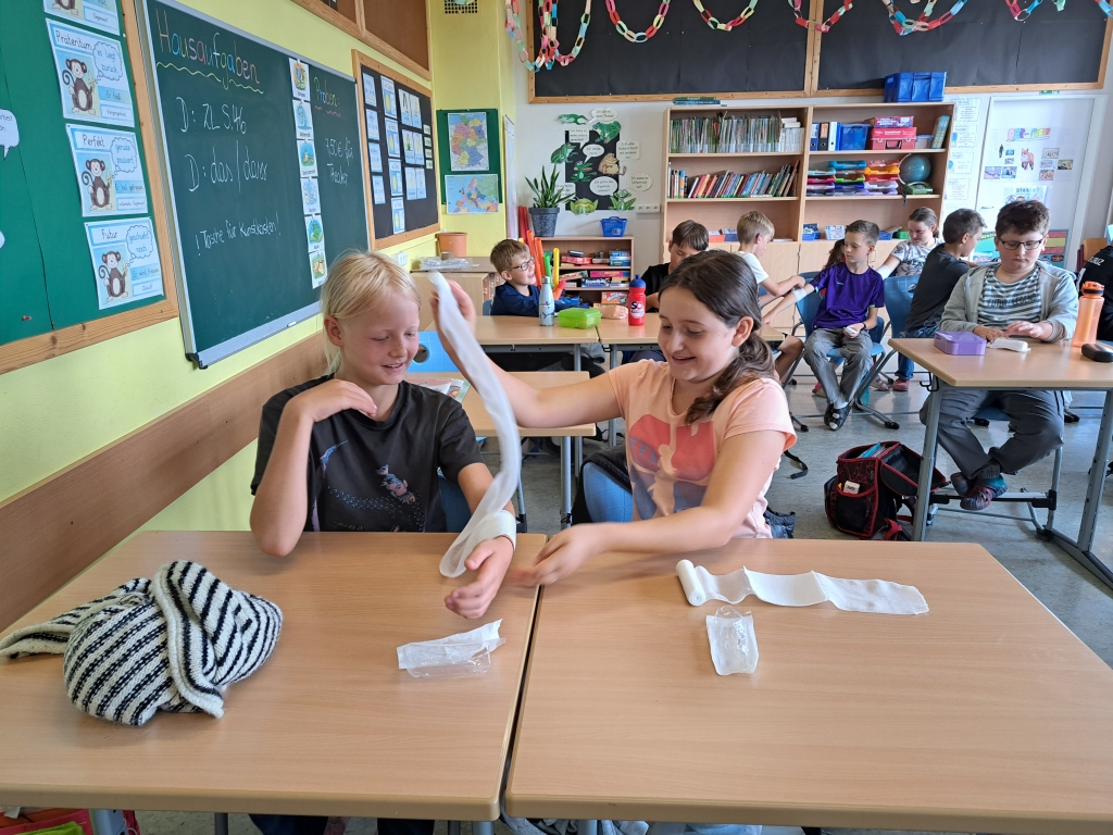 Unter dem Titel „kleine Gase, große Wirkung“ wurde der Treibhauseffekt den Kindern spielerisch näher gebracht und die Auswirkung der Erwärmung verdeutlicht. Zudem konnten die 3.Klässler ihren eigenen CO2-Fußabdruck durch ein Quiz feststellen und daraus für das Klima verbesserte Verhaltensweisen ableiten. Den Abschluss bildete ein Teamspiel, bei dem eine mit Schnüren befestigte Erde gemeinsam von der Klasse auf einem Flaschenhals vorsichtig abgelegt werden musste. Dieser wertvolle Schatz „Erde“ befand sich in den Händen der Schülerinnen und Schüler. Die Aufgabe konnte somit nur durch gemeinsame Kommunikation und das Ziehen an einem Strang bewältigt werden.