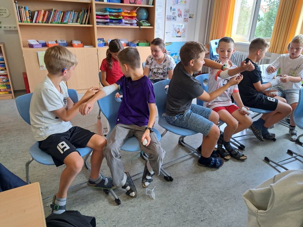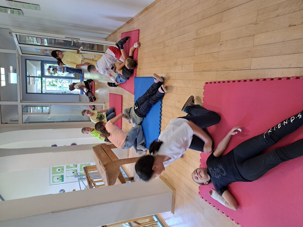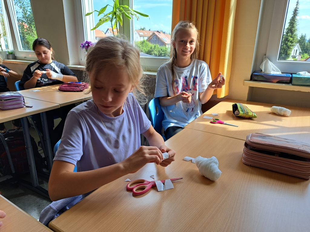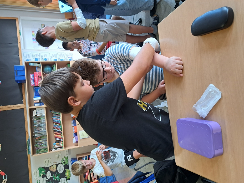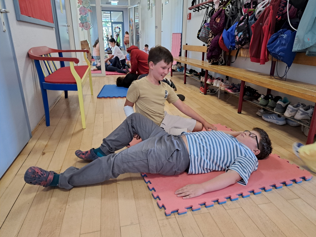 Im Rahmen der Fahrradausbildung absolvierten unsere vierten Klassen einen Erste- Hilfe- Kurs unter der fachkundigen Leitung von Frau Schiefer. Engagiert konnten die Schülerinnen und Schüler beider Klassen die stabile Seitenlage, das Anlegen von Verbänden sowie den richtigen Notruf einüben.