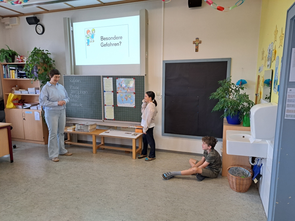 In gewohnt routinierter Weise hat Frau Taferner die Kombiklassen zu Beginn der Woche auf Gefahren im Straßenverkehr aufmerksam gemacht. In spielerischer Art konnten die Kinder als Fahrzeuge oder Fußgänger das Überqueren eines Zebrastreifens trainieren. Die Fahrzeuge mussten dabei auf die Schaltung einer Ampel achten und mit den Fußgängern Augenkontakt aufnehmen. Gemeinsam mit der Handpuppe „Adacus“ sangen die Kinder ein einprägsames Lied, das die Kinder beim Überqueren einer Straße immer wieder an das eingeübte Verhalten erinnern soll.